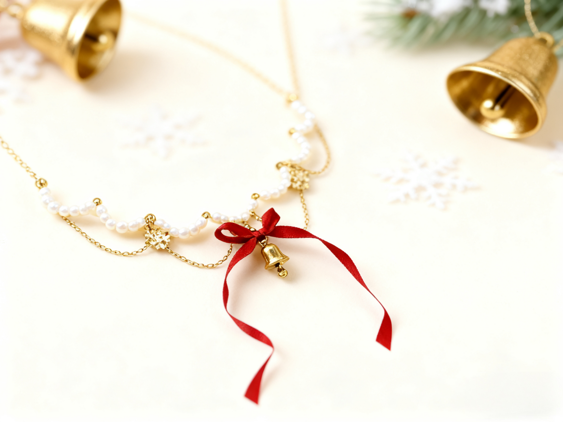 Pearl & Bow Christmas Bell Necklace: Y2K Niche Festive Bling for Gen Z